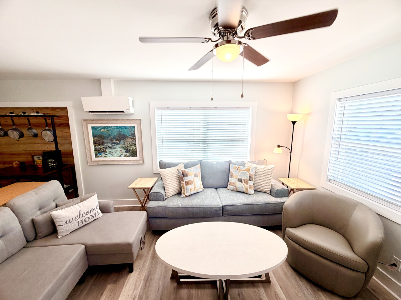 LIVING AREA: Open, bright, beach-chic. Comfy seating, smart TV, fast WiFi (500+ Mbps for streaming and remote work).