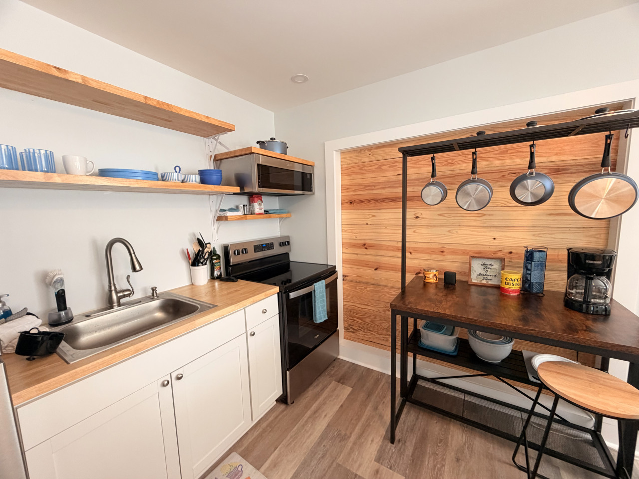 KITCHEN: Brand-new everything — refrigerator, stove, oven, microwave, coffee maker, all cooking basics. Kitchen island for meal prep or wine placement.