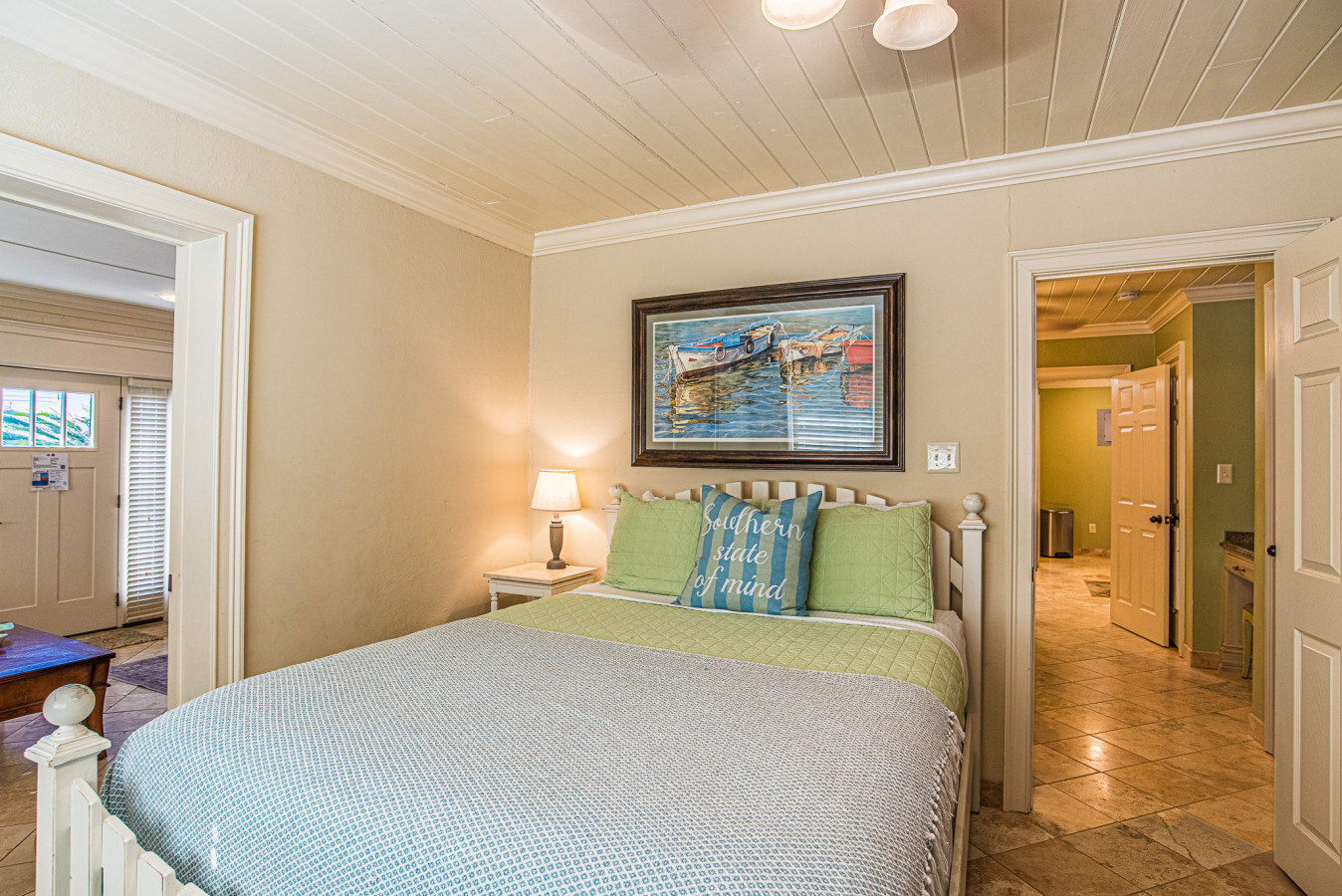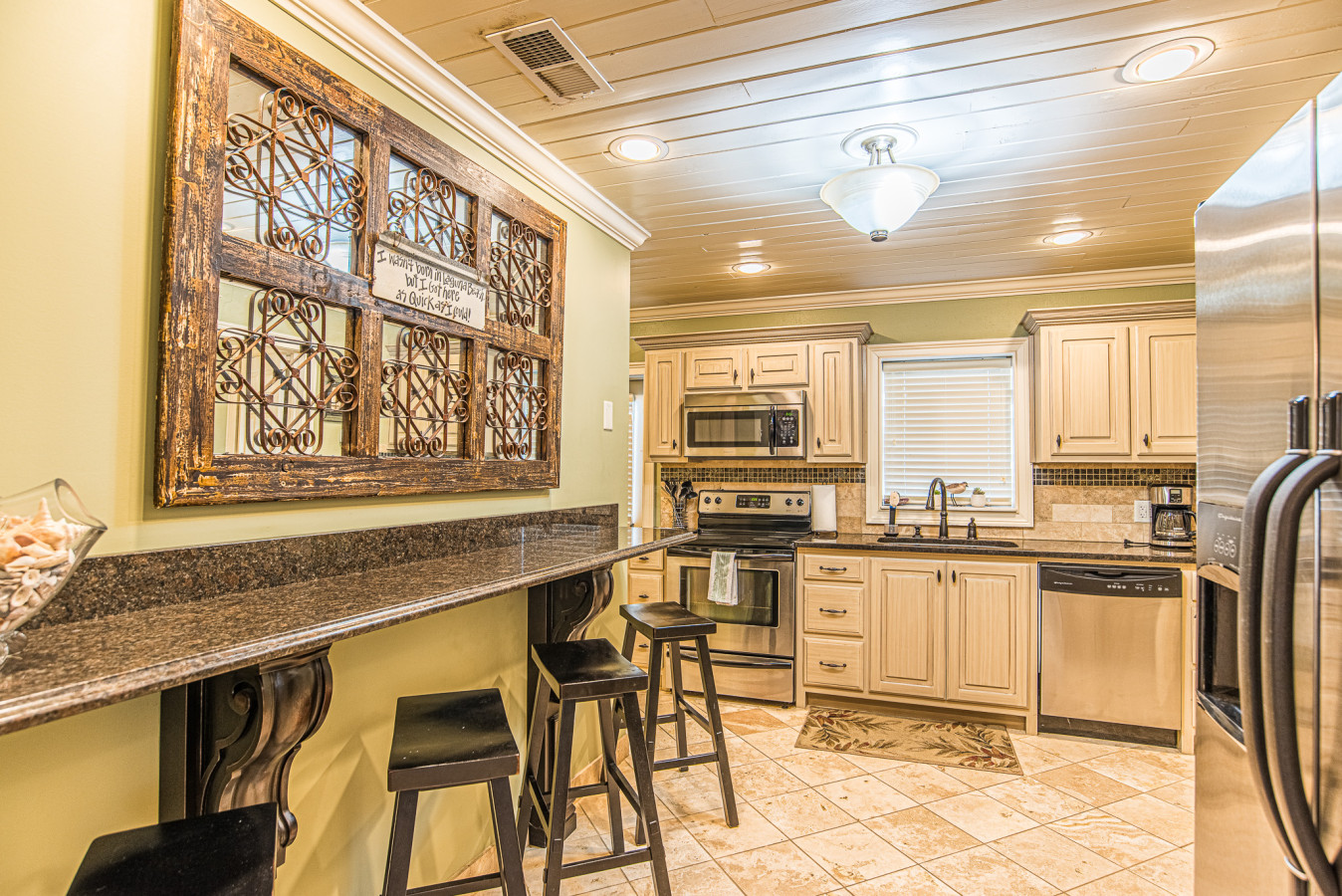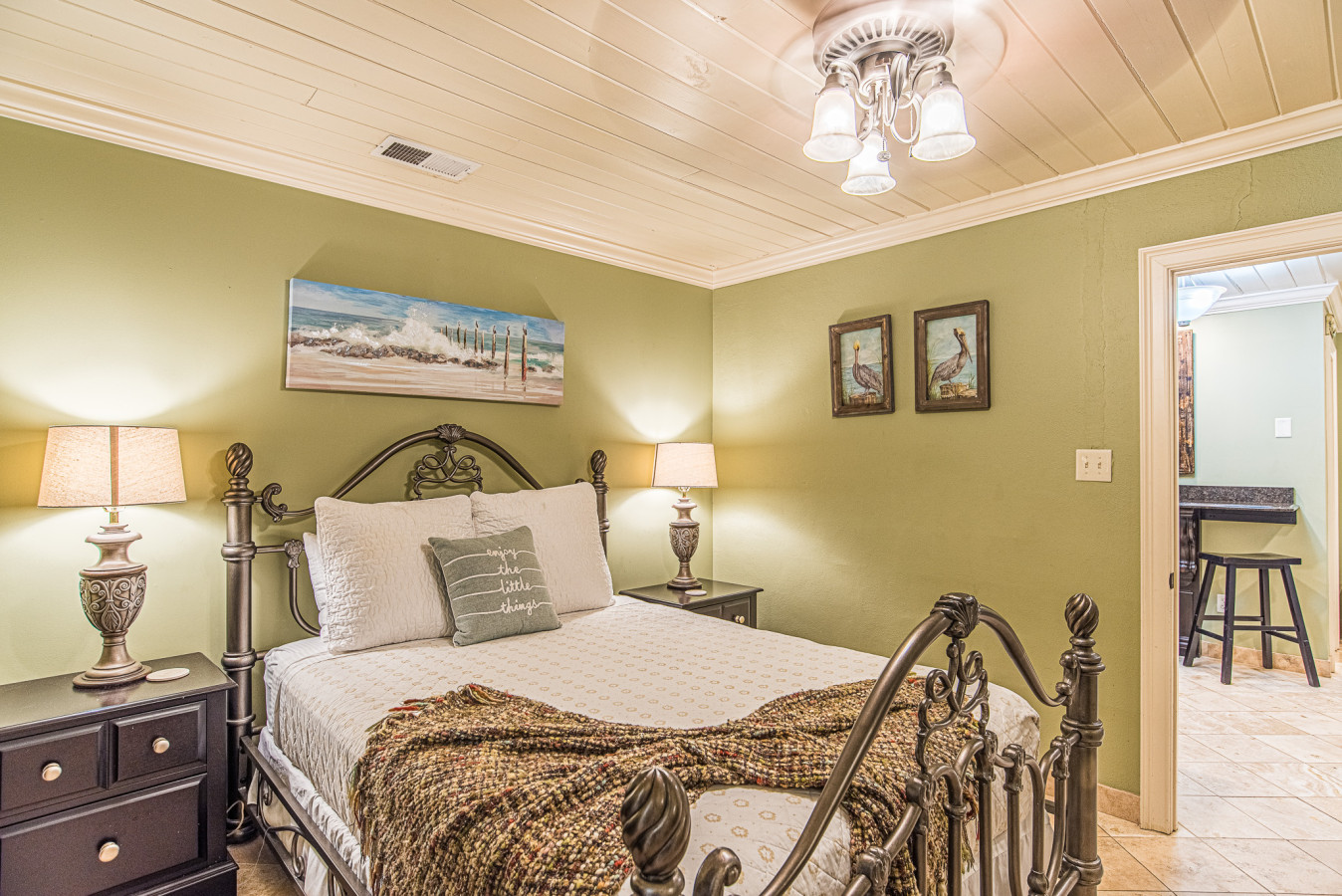 The beach, eatery, and grocery are within walking distance; a vehicle is recommended for shopping and sightseeing.