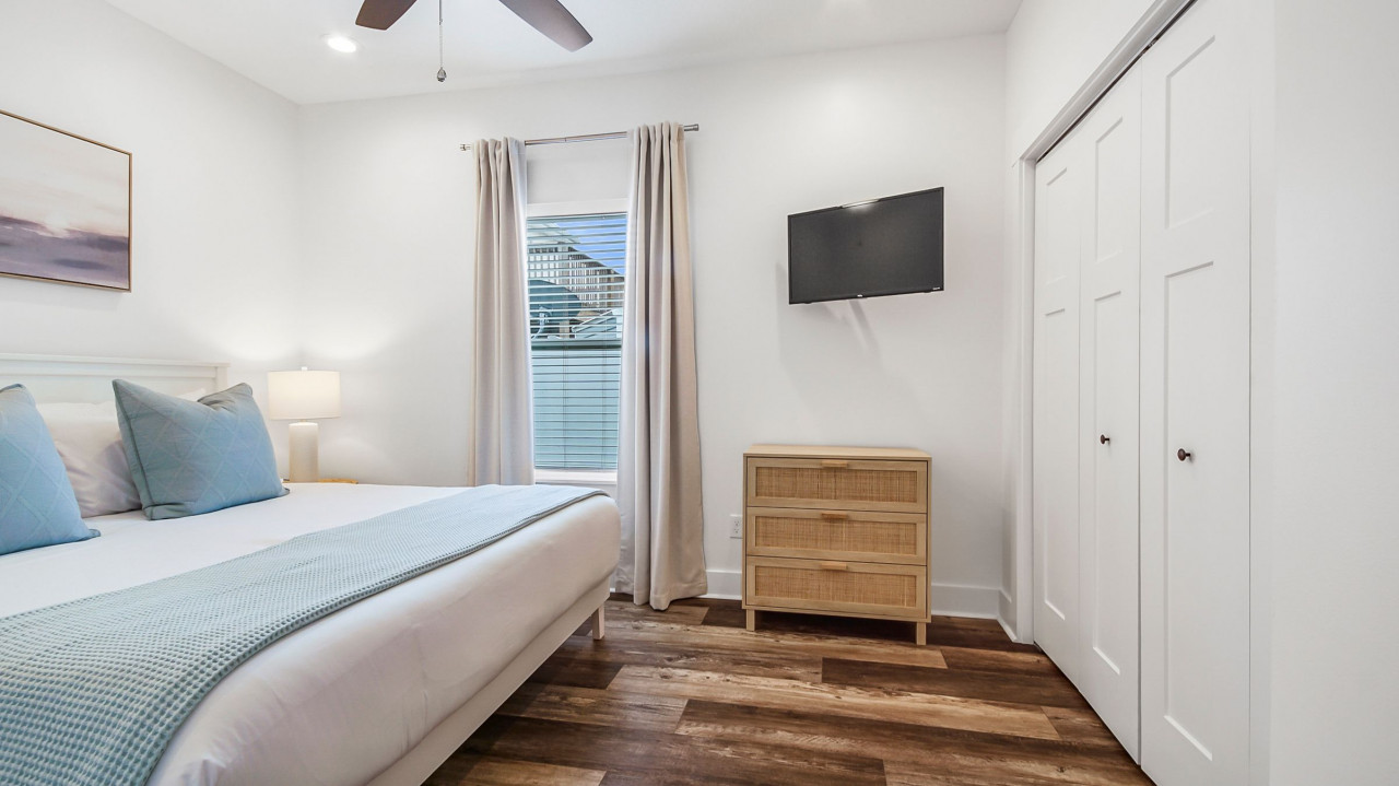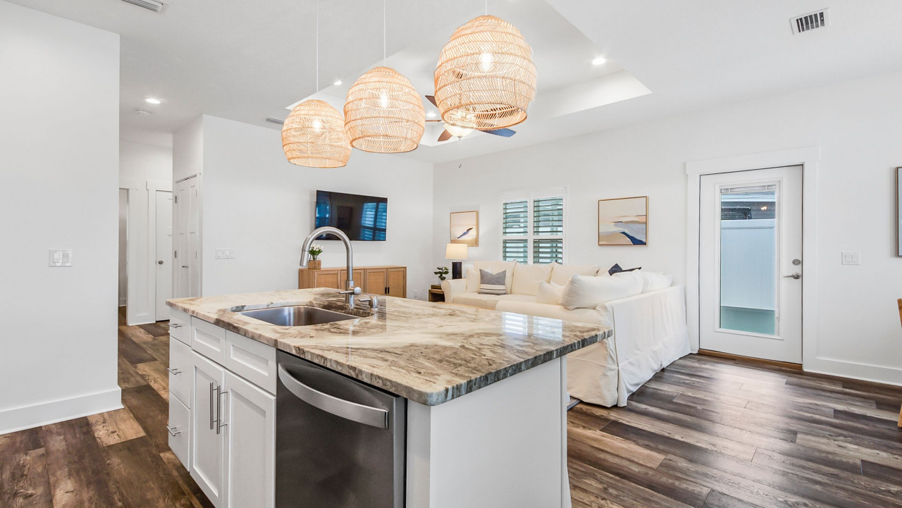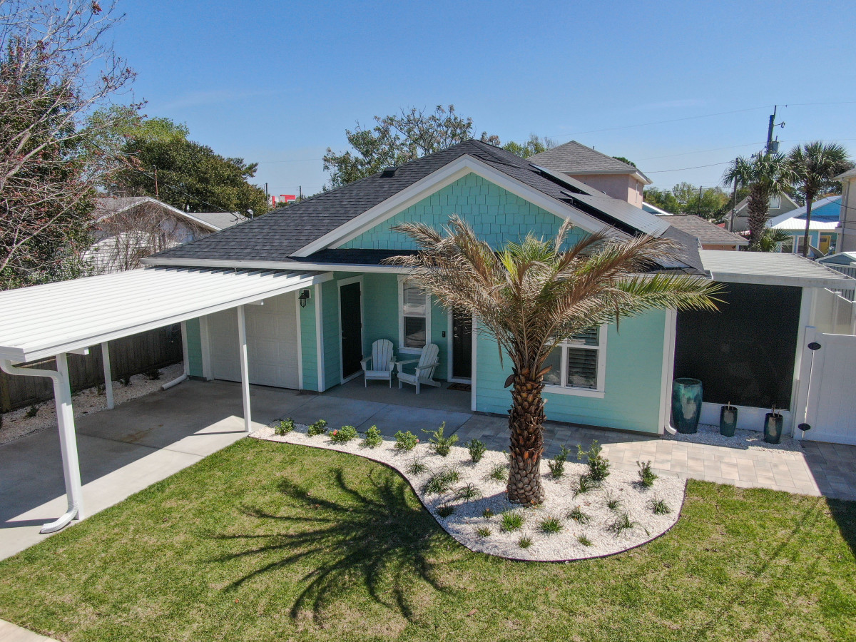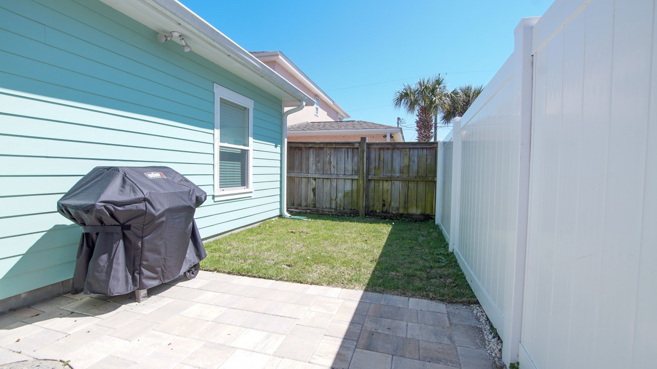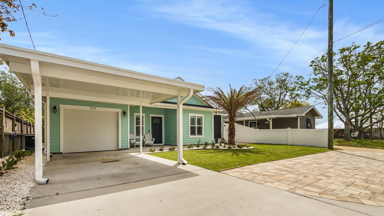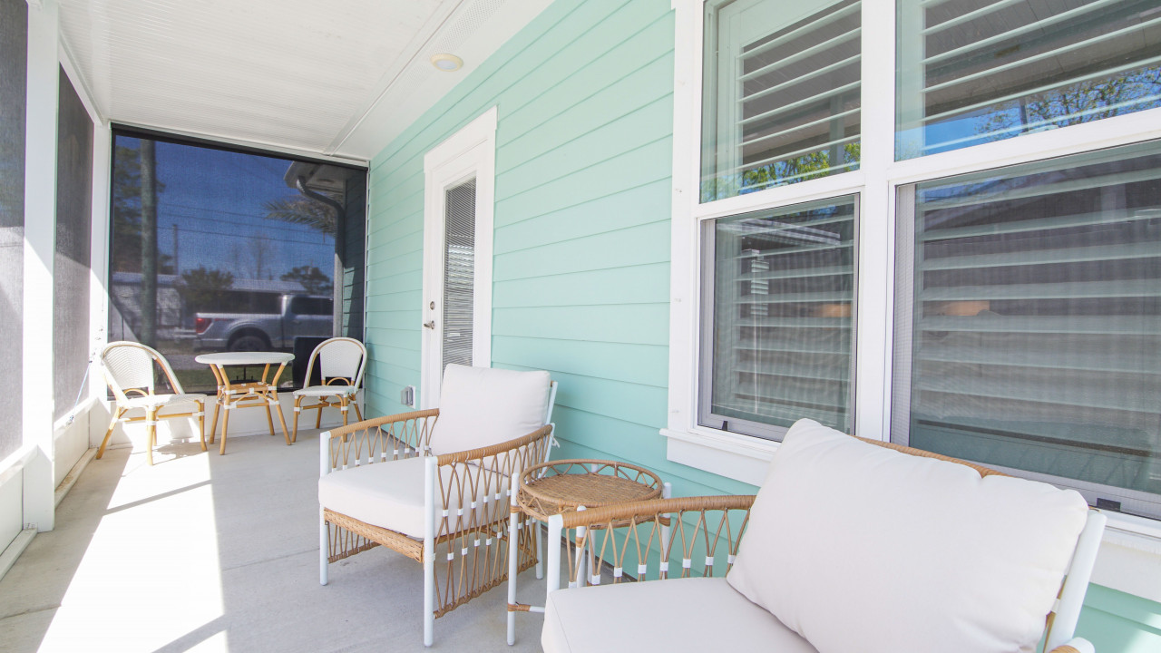 This home was designed to provide guests with a luxury modern coastal experience with all the comforts of home. The one story home provides guests with covered parking to keep your vehicle cool on the hottest days, parking for four vehicles, screened-in patio, three bedrooms, and two full baths. As you enter the home you will see the kitchen on your left and the living/dining room on your right. The dining room features a large rectangular table with seating for six, the living room features a large L-sectional allowing seating for six with a 55″ TV. Walking past the kitchen, entering the hallway you will see the laundry closet with a large, stacked washer and dryer. Walking further you will see the hall bathroom and master bedroom on the left, bunk room straight ahead, and the second king bedroom on your right. Walking outside you will enter the screened-in patio with seating for four and a large paver patio with a fence for privacy. A Weber grill is provided for guests to enjoy a great meal at home.
