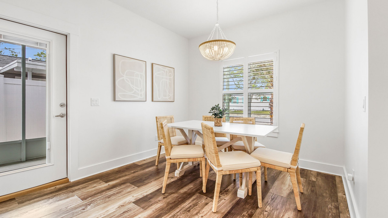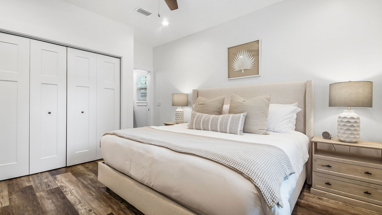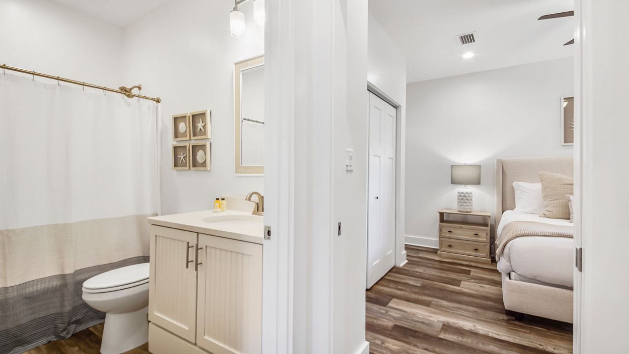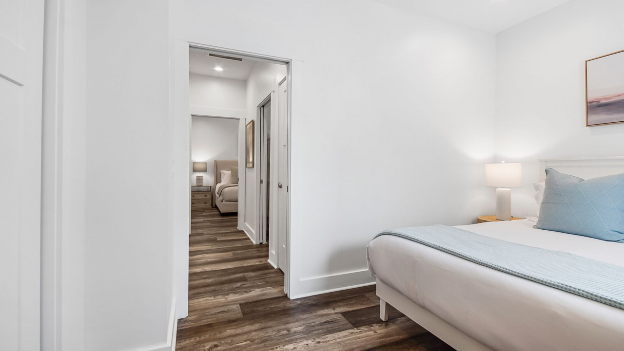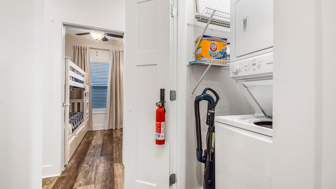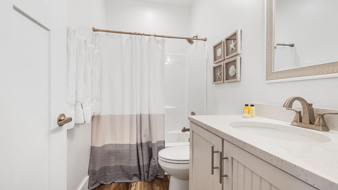This home was designed to provide guests with a luxury modern coastal experience with all the comforts of home. The one story home provides guests with covered parking to keep your vehicle cool on the hottest days, parking for four vehicles, screened-in patio, three bedrooms, and two full baths. As you enter the home you will see the kitchen on your left and the living/dining room on your right. The dining room features a large rectangular table with seating for six, the living room features a large L-sectional allowing seating for six with a 55″ TV. Walking past the kitchen, entering the hallway you will see the laundry closet with a large, stacked washer and dryer. Walking further you will see the hall bathroom and master bedroom on the left, bunk room straight ahead, and the second king bedroom on your right. Walking outside you will enter the screened-in patio with seating for four and a large paver patio with a fence for privacy. A Weber grill is provided for guests to enjoy a great meal at home.