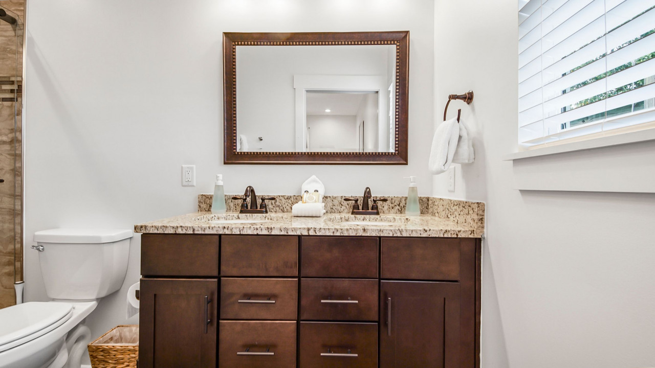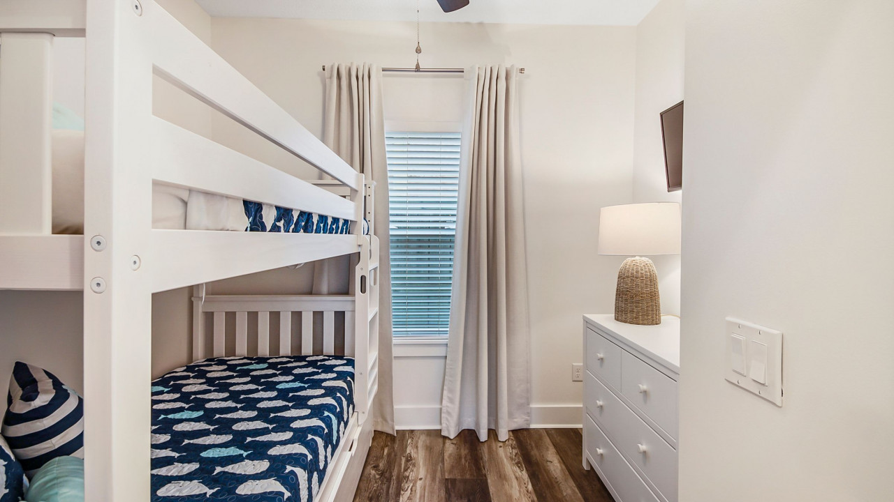 Newly added to the rental market, its custom craftsman touches and outdoor bonus space will make all guests feel at home! The kitchen is stocked and outfitted with steel appliances, while a large quartz breakfast bar makes meals and cleanup a breeze! The master king bedroom has a large closet and a full ensuite bathroom with a shower. The guest master also has a large closet and shares the hallway bathroom with the bunk room.