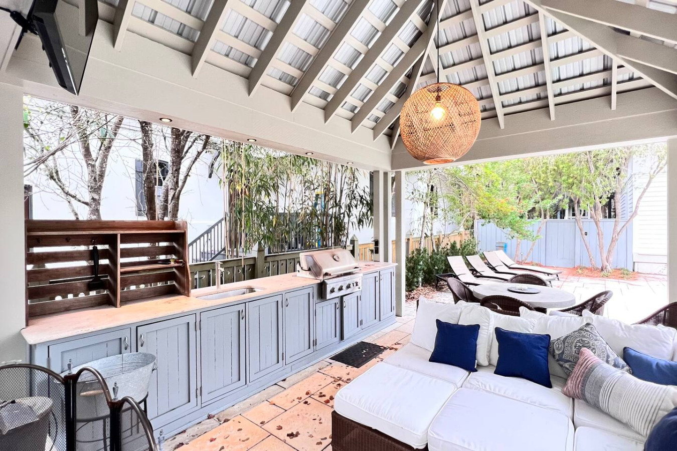 » Large outdoor smart tv in covered lanai to watch all the sports while enjoying the evening grilling or by fire.