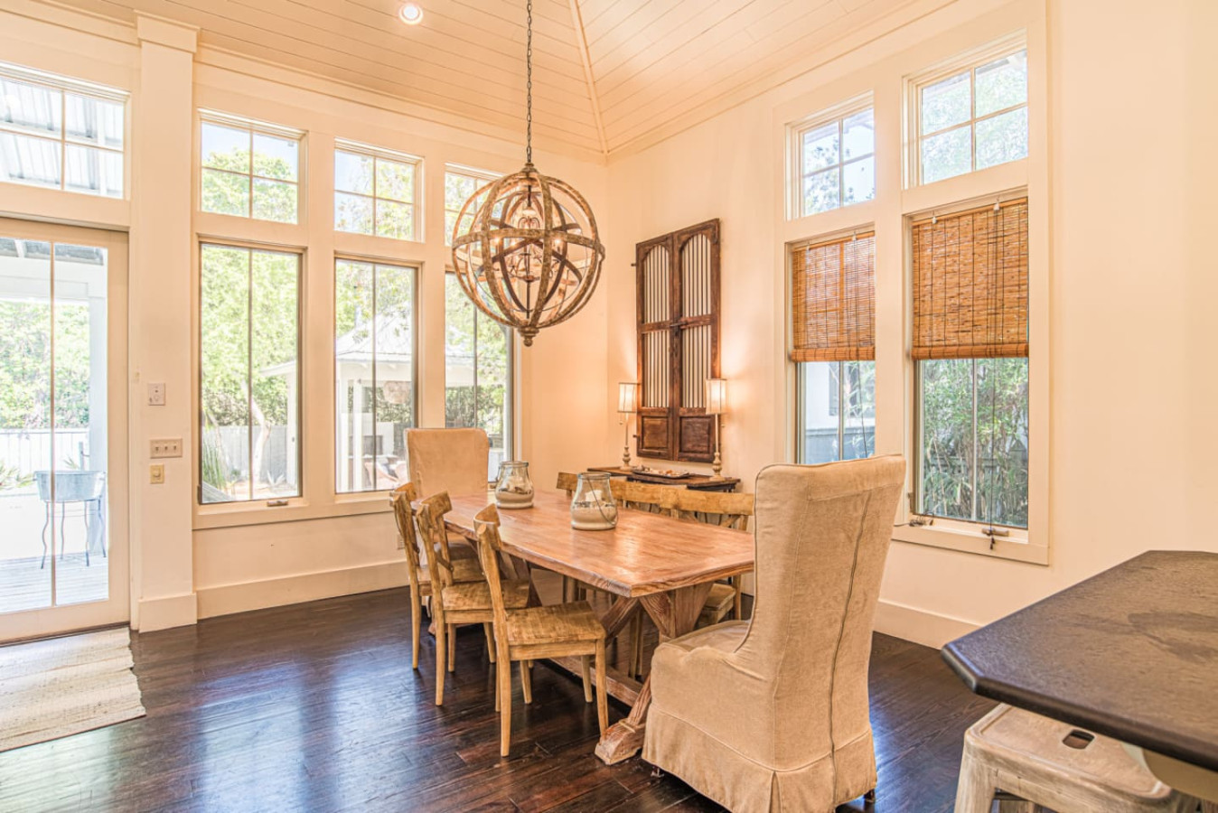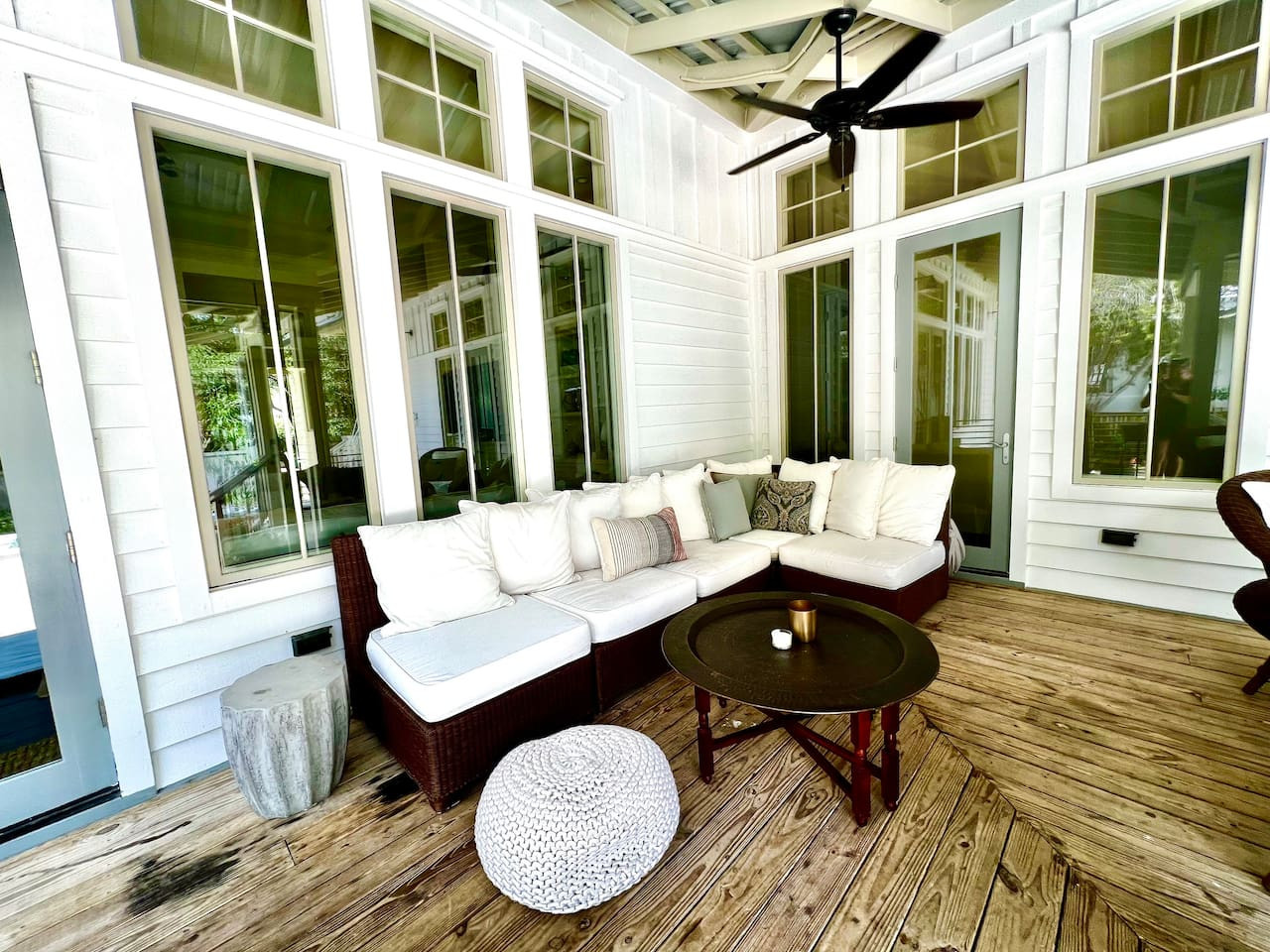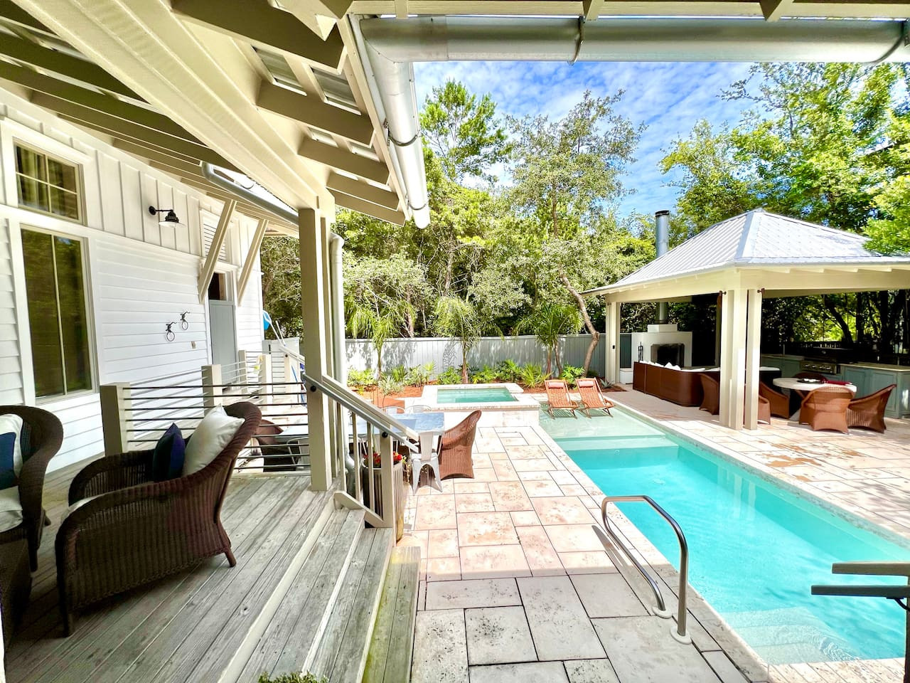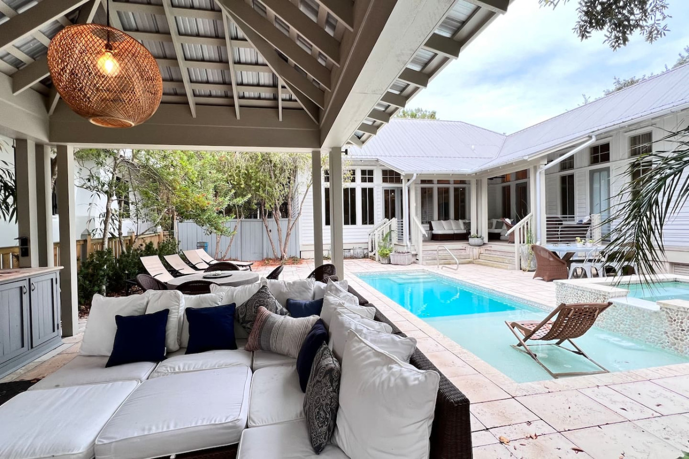 Welcome to Zen Den! This charming West Indies-style cottage is unique by design as it wraps around one of the most stunning private courtyards in Rosemary Beach. Surrounded by custom-laid natural stone pavers and a large wraparound deck, non-swimmers have plenty of places to lounge with outdoor sofas, chaise lounges, and two outdoor dining sets.