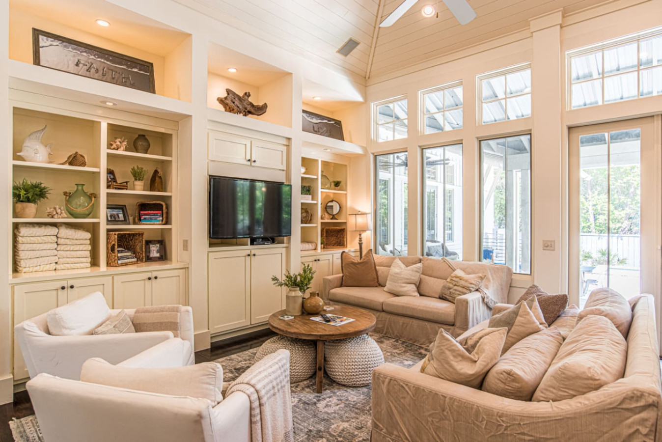 » Outdoor lanai with oversized Pottery Barn Sunbrella patio couches and ottomans.